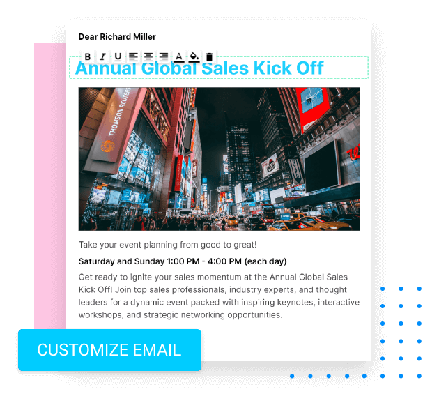 With our Event Email Marketing Engine, you can easily customize your emails to match your brand and event theme. Choose from a variety of fonts, colors, and backgrounds to create a personalized email that stands out from the crowd. Our intuitive drag-and-drop editor makes it easy to add images, videos, and other multimedia content to your emails, ensuring that your message resonates with your audience.