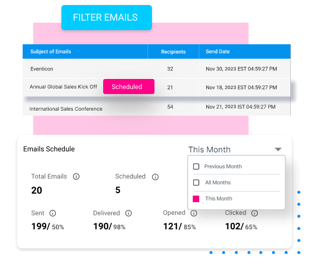 Our Email Marketing Engine allows you to filter your contact list and schedule your emails for optimal delivery. Choose to send your emails before the event start date, or set a custom date and time for each email. With our easy-to-use scheduling interface, you can ensure that your emails reach your audience at the right time and with the right message.