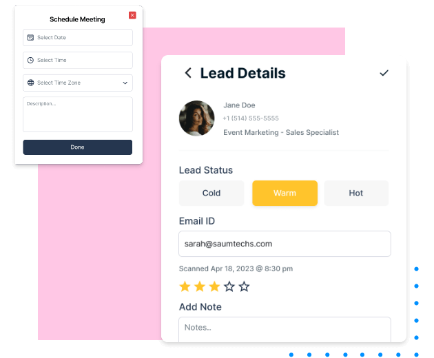 Our Add Notes feature allows you to take detailed notes for each scanned lead. You can quickly jot down important details like product interests, specific follow-up actions, or any other information that might be useful in your post-event follow-up efforts. With our intuitive note-taking interface, you can easily add notes for each lead right from your mobile device or tablet.