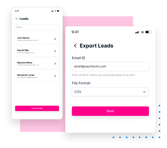 With our Export Leads feature, you can easily export leads to a variety of formats, including Excel and CSV. This makes it easy to integrate your leads into your existing CRM or marketing automation software, allowing you to quickly and easily follow-up with your leads and track their progress over time. Our Export Leads feature is fast, reliable, and easy to use, ensuring that you get the most value from your event leads.