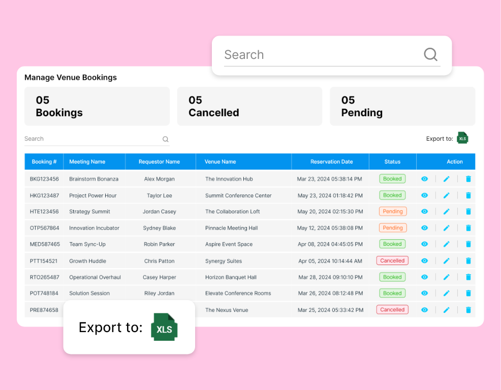 - Book venues & facilities based on location, capacity, amenities, etc.