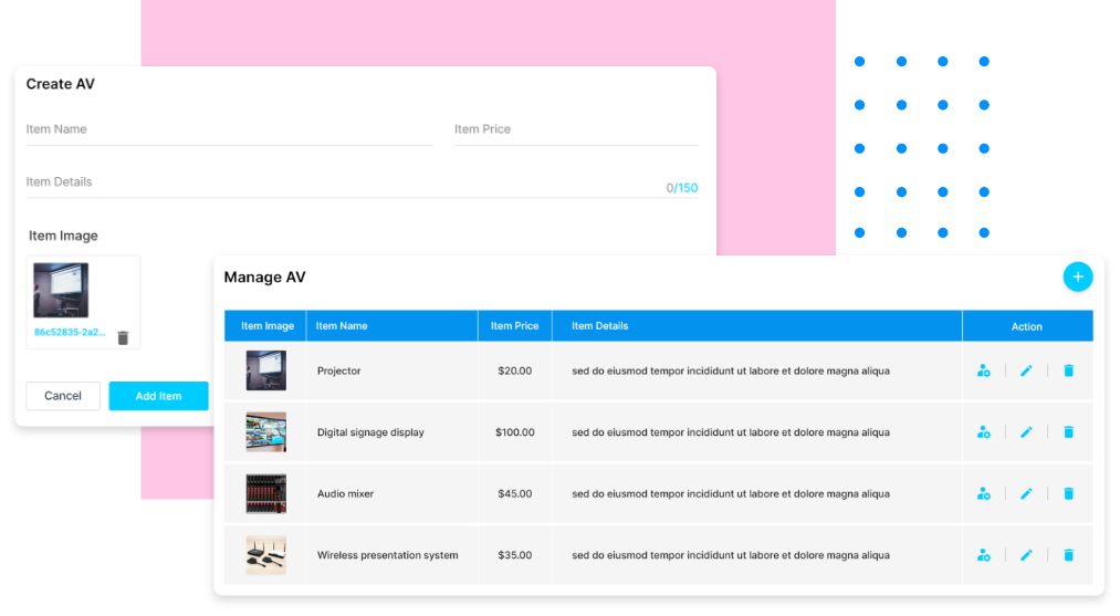 - Enable clients to book and reserve A/V equipment along with venues.