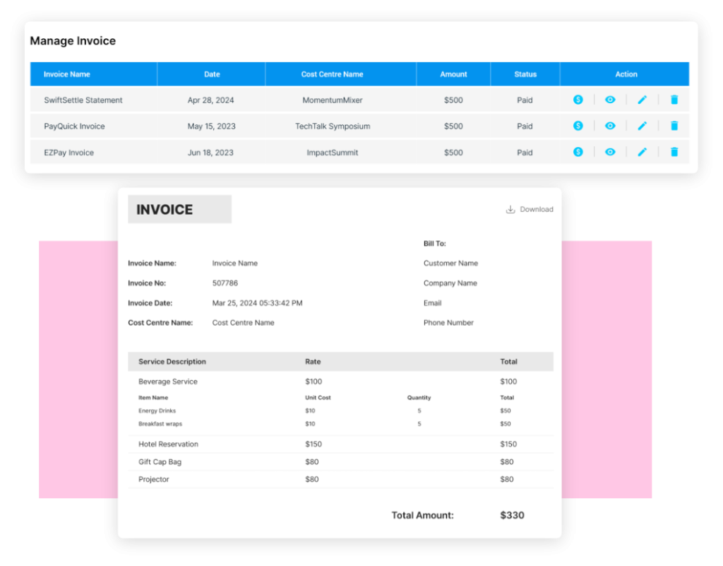 - Utilize customizable invoice templates and itemized details such as booked services, resource usage, pricing, taxes, etc.