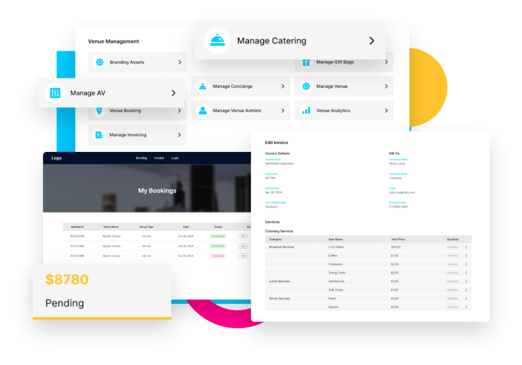 Create, Customize Venues, Spaces + Manage Bookings + Manage Resources + Automate Workflows + Customized Reports + Invoicing + Catering Management